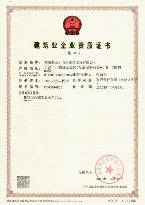 湖南麓上住宅工业科技有限公司(湖南麓山小雨木别墅工程有限公司)是湖南较早从事装配式建筑的的企业之一,是国家高新技术企业、湖南省级装配式建筑产业基地,具备建筑施工总承包三级资质和装修装饰工程专业承包二级资质。